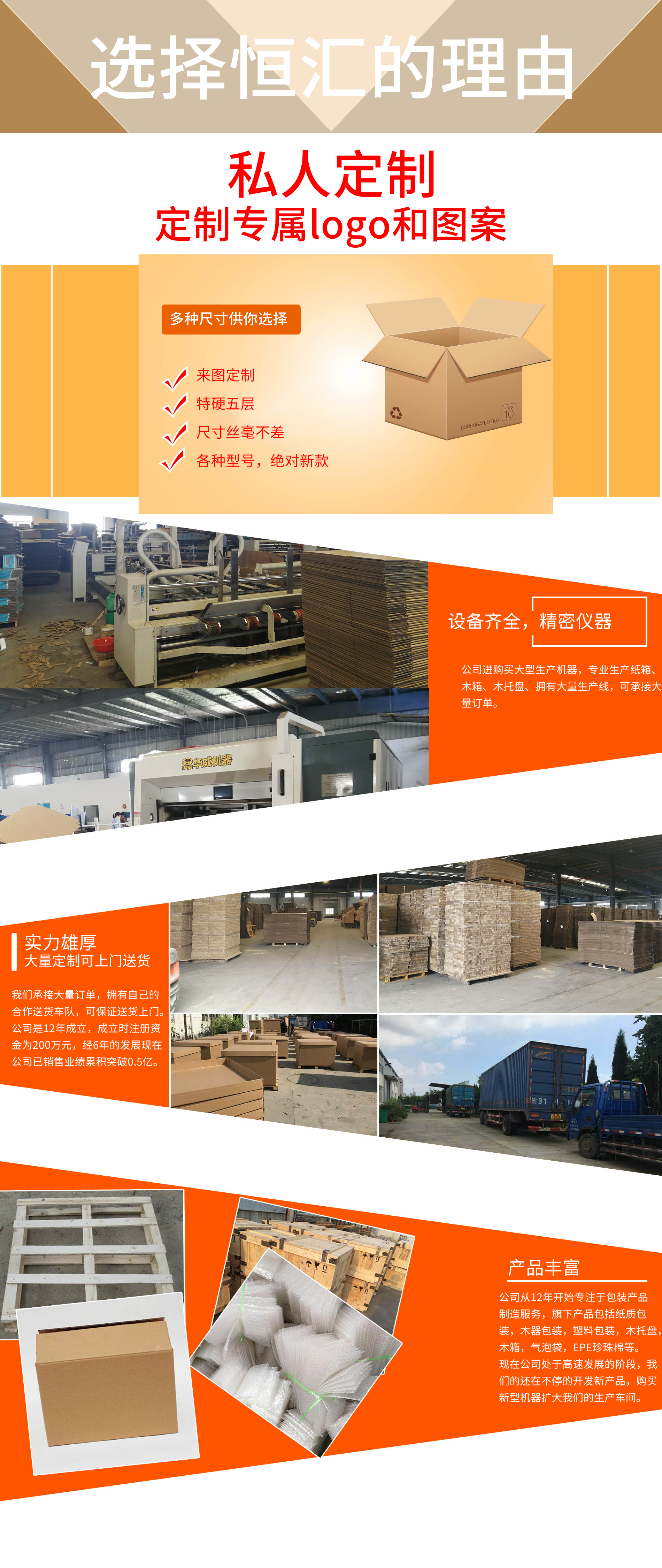 蕪湖恒匯包裝有限公司于2012年4月12日成立,公司地址現位于蕪湖市經濟開發區泰山路26號( 蕪湖鄭明物流院內),本公司主要生產紙質包裝、木器包裝、塑料包裝( EPE珍珠棉、氣泡袋、平口袋)等包裝產品,我司擁有完整科學的質量管理體系。本公司自成立后堅持以“信任從品質開始"的理念與很多客戶進行友好業務往來,業務逐年增長,為了擴大規模再生產,本公司又于2019年12月注冊蕪湖金淮商貿有限公司,兩家公司以互聯網+實體模式共同發展,爭取到2022年銷售業績突破2億元,公司將實行資源整合統一管理模式,將一如既往堅持‘務實創新,團結奮進,精益求精’的企業精神和'質量為先,客戶至上’的經營宗旨,不斷完善服務體系,以社會化的服務精神,真誠為廣“大客戶提供完善的服務,以熱情的銷售,全程陪同,及時熟知您的需求,量身定制,為您節省成本,節約能耗,為您企業發展插上騰飛的翅膀。讓我們成為客戶的同時,永遠成為朋友。蕪湖恒匯包裝有限公司...